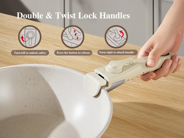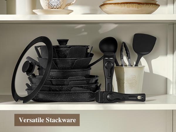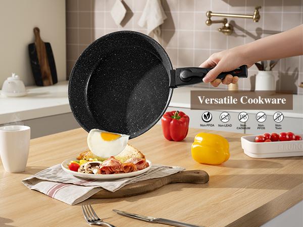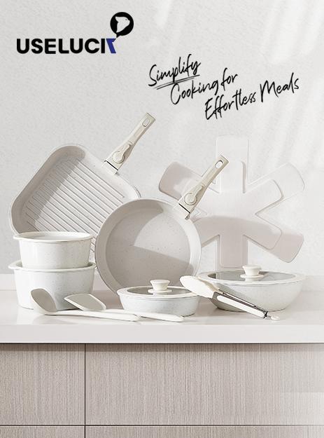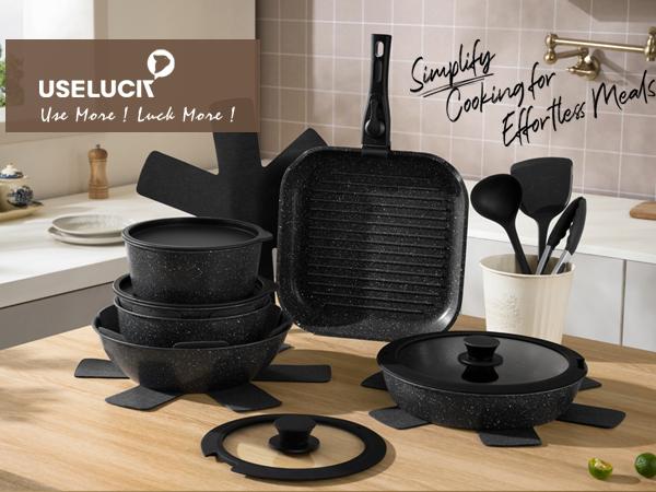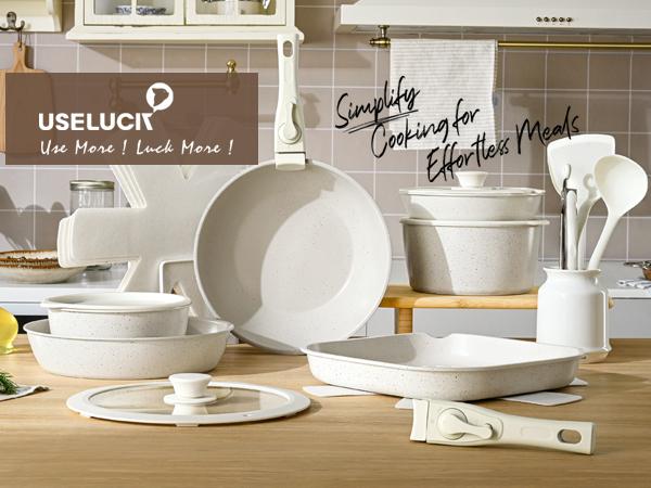 Detachable handle cookware: Useluck detachable handle pots and pans feature a double-lock for safety; Remove the handle to prevent overheating; Our removable handle pots and pans switch easily between stove, oven, grill, fridge, and tableKitchen cookware set includes: 1.8QT & 2.1QT saucepans, 8" & 10" frying pans, 3.2QT sauté pan, 11" square grill pan, 2 removable handles, 8" & 10" glass lids, 7" & 8" fridge lids, 5 pot protectors, silicone turner, ladle, tongsNon-Stick Excellence: The granite cookware set ensures effortless cooking and cleaning; With minimal oil, food slides off easily, promoting a healthy diet; Free of PFOA, Pb, and Cd, its stain-resistant surface offers durable performanceEasy Cleaning: Each Useluck pots and pans set non-stick is dishwasher-safe, with handwashing recommended for best results; A quick rinse or wipe keeps your cookware set and kitchen clean and tidyUniversal Stove Compatibility: This induction cookware pan set works with all stoves, including induction, gas, electric, and ceramic; Oven-safe up to 550°F, silicone lids up to 350°F, and sealable lids from -100°F to 170°FUseluck pots and pans are made with a sprinkle process, please note that it is not a defect
