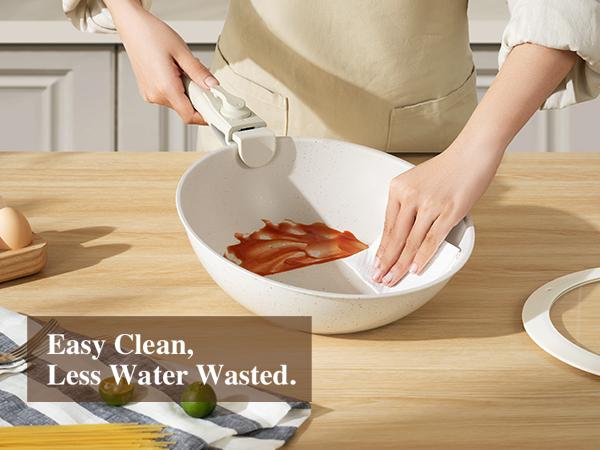 • Ich liebe dieses Kochtopfset! So einfach zu reinigen und zu verstauen. Die Qualität ist super und es sieht auch noch gut aus. Endlich habe ich genug Platz im Schrank! [痛点2]